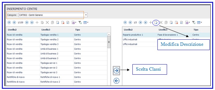 - Modifica delle Descrizioni Centri scelte per la personalizzazione dei centri di costo default
