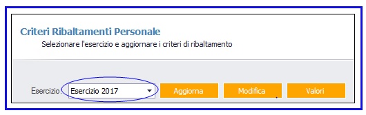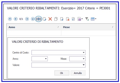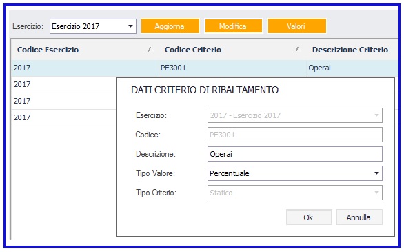È la maschera dedicata all’inserimento dei criteri - valori (% o numerici) che consentono alla procedura di suddividere il centro da ribaltare in più centri di costo finali