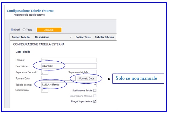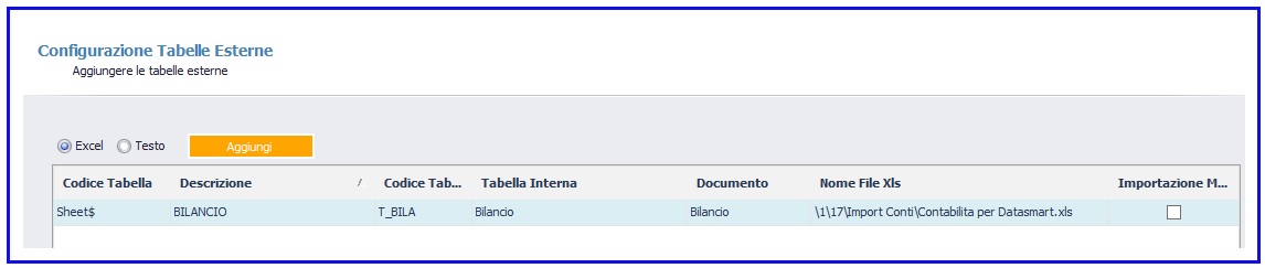 Dopo aver definito il formato del file bilancio (Excel o testo), grazie al pulsante “Aggiungi” è possibile iniziare i collegamenti tra file esterno selezionato e DataSmart