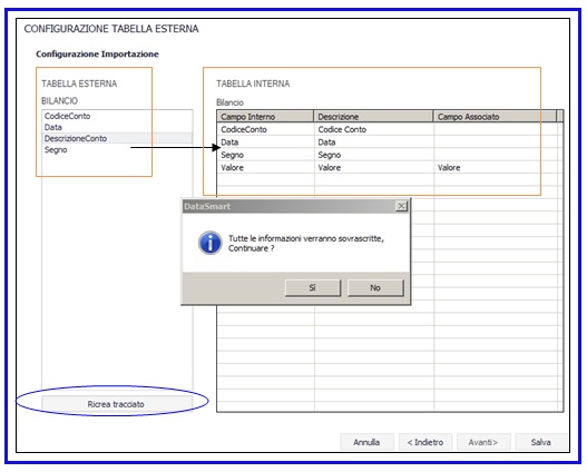 Attraverso il pulsante ricrea tracciati, DataSmart legge i campi esterni e li elenca nella parte sinistra della tabella di associazione.